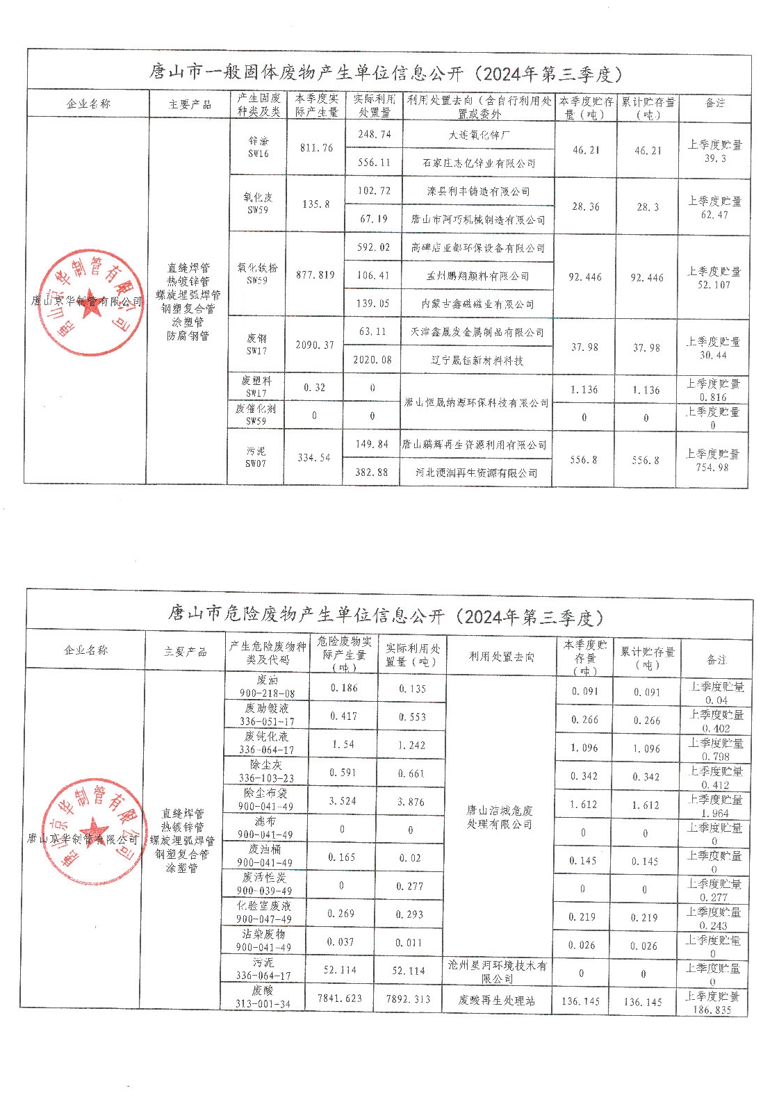 唐山京華制管有限公司2024年第三季度信息公開